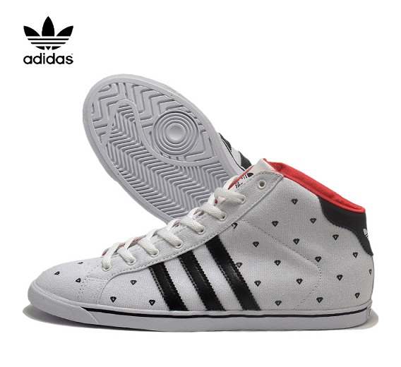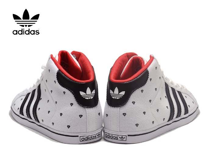 バスケットシューズの名作を削ぎ落とし、履きこなし易いスタイルにデザインした新作コートスター・スリム・ミッド。ここではくるぶし丈のキャンバスアッパーにダイヤモンドのプリントをあしらい、合成レザーの3ストライプ/サテン生地のライニング/トレフォイルロゴ入りのヒールパッチ/バルカナイズ仕様のラバー製アウトソールを組み合わせている。