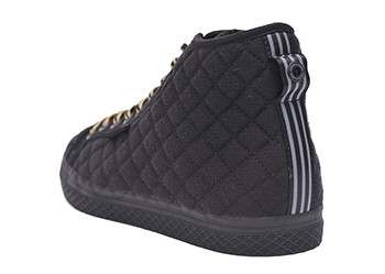 ここではブラックのキルティング生地に、ゴールドのスティッチをあしらい、バルカナイズ仕様のアウトソールを組み合わせたJAPAN限定モデル。