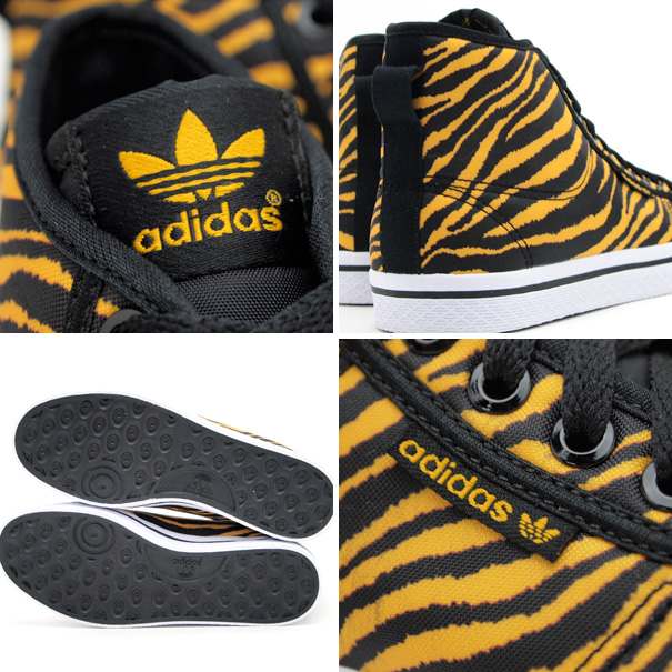 アディダス オリジナルス のシューズ(HONEY MID W LD)。このプレミアムバージョンでは虎のプリントをあしらったナイロンアッパーとジャージー素材の心地いいライニングにバルカナイズ仕様のアウトソールを備え付けている。