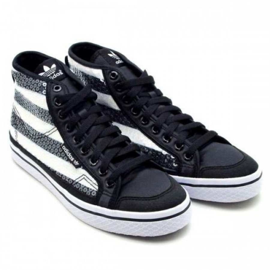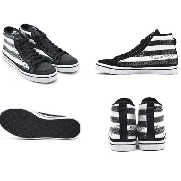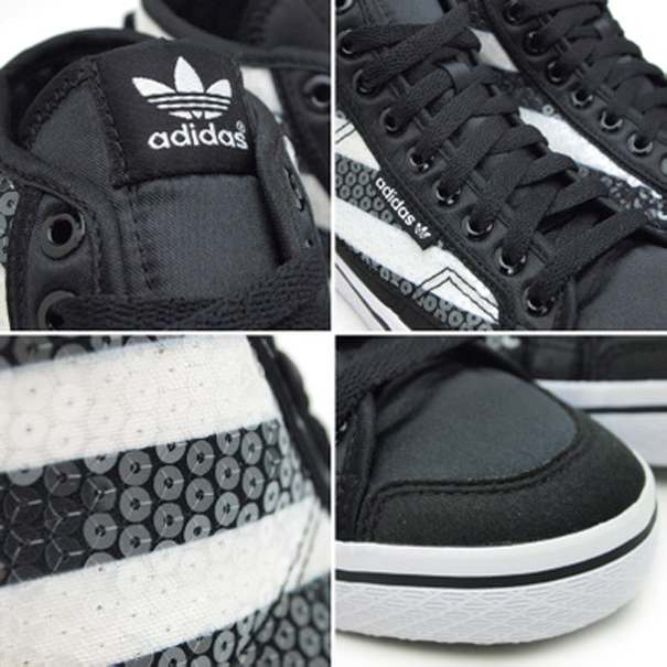 adidas Originals (アディダス オリジナルス) スニーカー。 このプレミアムバージョンではアッパーに透明なスパンコールを散りばめ、その下には3ストライプがのぞいて見える。またアッパーにサテンのディテール/柔らかなサテンのライニング/バルカナイズ仕様のアウトソールを、それぞれあしらっている。