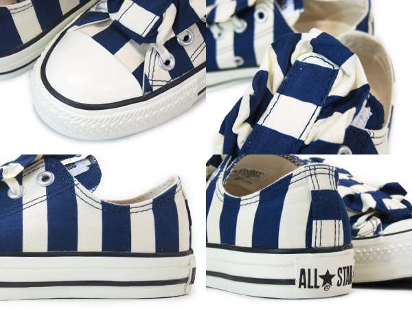 CONVERSEより、ファッショナブルなレディースライン【CHUCKS SISTERS】のアイテムが登場。 女の子に人気のフリルを、取り外し可能なタン飾りにアレンジした2WAY仕様のデザインとなっております。こちらのモデルはストライプ柄が施されたモデルとなっております。(コンバース オールスター フリルタイ OX)