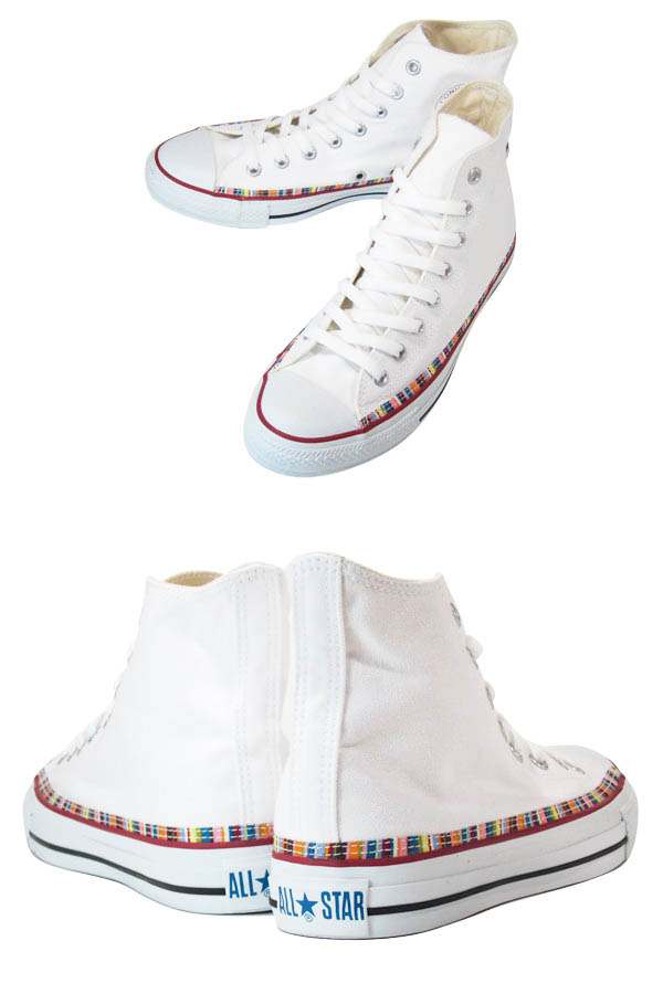 1917年に登場し、現役最長のバッシュとも言われている永遠の定番コンバースのオールスターに、ディティールアレンジモデルが登場。アパレルアイテムのポイントとして使用されるマルチカラーがアッパー裾部分に施されたアイテム。ストライプの替えシューレースが付属します。(コンバース オールスター ヘムストライプ HI)