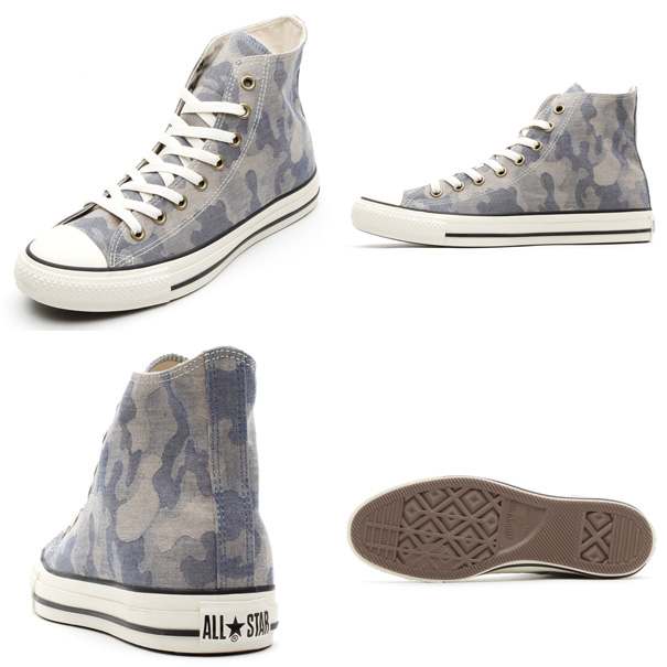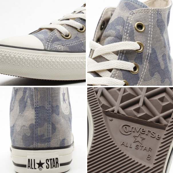オールスターの素材アレンジモデルです。流行素材であるジャカード織り素材を採用したオールスターです。凹凸のある独特の素材に、流行の柄であるカモフラージュ柄を落とし込んだモデルです。同色系の渋めのアッパー柄に合わせてハトメにはアンティークゴールドを採用しています。