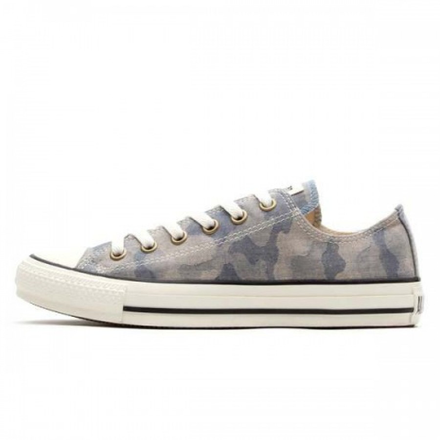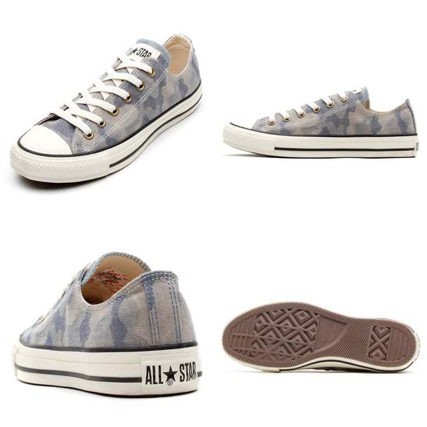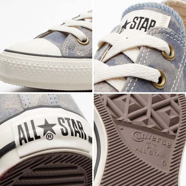 オールスターの素材アレンジモデルです。流行素材であるジャカード織り素材を採用したオールスターです。凹凸のある独特の素材に、流行の柄であるカモフラージュ柄を落とし込んだモデルです。同色系の渋めのアッパー柄に合わせてハトメにはアンティークゴールドを採用しています。