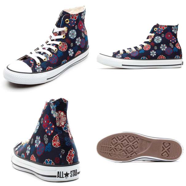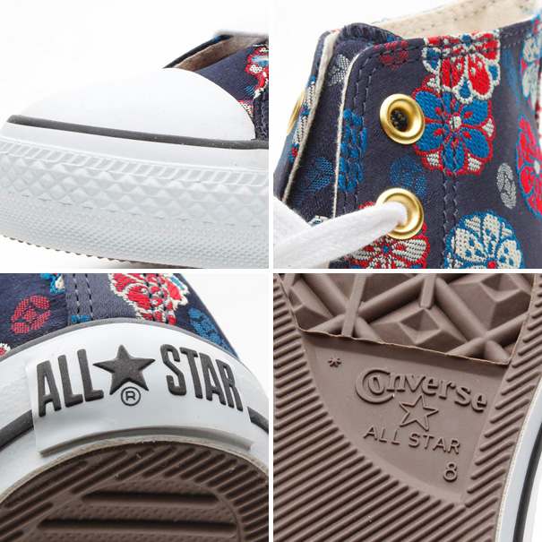 オールスターの素材アレンジモデルです。京都の伝統織物「西陣織」をアッパー全面に贅沢に使用したアイテムです。「吉祥七宝に八重桜」と名づけられた、「円満」意味を持つ七宝柄と、「幸せが幾重にも重なるように」と願いをこめられた八重桜の柄が特徴の織り素材です。