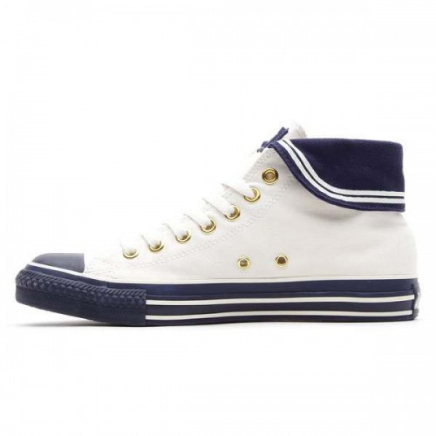 オールスターのパターンアレンジモデルです。アメリカ海軍のユニフォーム「セーラー服」がモチーフになっています。モチーフに見られる特徴的な襟をターンダウンタイプにて表現しています。踵部分にイカリマークをゴールドでプリントしているのがポイントになっています。春夏の定番マリンスタイルをわかりやすく表現したアイテム。
