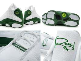 Jordanシリーズでも特に熱狂的なファンが多いAir Jordan 13からBoston Celticsのスタープレーヤー"Ray Allen"の3ポイントシュートの通算成功数歴代1位達成を記念したPEが登場です!!チームカラーでもあるホワイトとグリーンのシンプルな2トーンに、アッパーの上質なレザーが引き立った美しい仕上がりになっております。タン部分にはシュートフォームのシルエットがステッチされております。極少数のみリリースの為、極めて入手困難なモデルとなっております。お見逃しなく!!