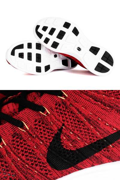 従来のフットウエアの製造方法の常識を覆す「ナイキ フライニット」テクノロジーにより、糸で精密に編み上げられたワンピース構造のアッパーは軽量かつ製造工程における素材のロスを最小限に抑え環境への配慮も忘れない。