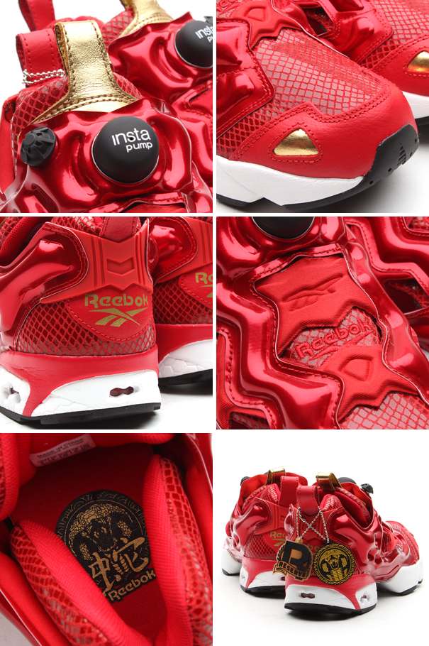 1990年代のハイテクスニーカーブームを「NIKE AIR MAX」と共に支えたReebok屈指の名作ランニングモデル【INSTA PUMP FURY】から、国内取扱い店舗限定モデルが登場。中国の旧正月を祝した干支モデルとなった今作は、2013年の干支でもある”巳(Snake)”をモチーフにスネーク型押しのアッパーに中国圏で縁起が良いとされるレッド×ゴールドのカラーリングを採用。『THE PUMP』テクノロジーやHEX LITEなど当時の革新的で色褪せる事のない名作に新たなエッセンスが落とし込まれた注目の1足になっています。